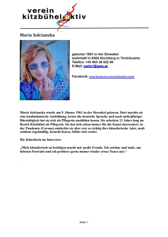 Seite 1Maria Solcianskageboren 1961 in der Slowakeiwohnhaft in 6365 Kirchberg in Tirol/AustriaTelefon: +43 664 36 632 80E-Mail: perle1@gmx.atFacebook: www.facebook.com/solcianska.mariaMaria Solcianska wurde am 9. J%u00e4nner 1961 in der Slowakei geboren. Dort machte sie eine kaufm%u00e4nnische Ausbildung, lernte die deutsche Sprache und nach mehrj%u00e4hriger B%u00fcrot%u00e4tigkeit hat sie sich als Pflegerin ausbilden lassen. Sie arbeitete 21 Jahre lang im Bezirk Kitzb%u00fchel als Pflegerin. Sie hat sich schon immer f%u00fcr die Kunst interessiert, in der Pandemie (Corona) entdeckte sie aber erst so richtig ihre k%u00fcnstlerische Ader, malt seitdem regelm%u00e4%u00dfig, besucht Kurse, bildet sich weiter.Die K%u00fcnstlerin im Intervie%u201eMich k%u00fcnstlerisch zu bet%u00e4tigen macht mir gro%u00dfe Freude. Ich zeichne und male, am liebsten Portraits und ich probiere gerne immer wieder etwas Neues aus.%u201c.