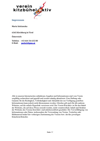 Seite 17ImpressumMaria Solcianska6365 Kirchberg in Tirol%u00d6sterreichTelefon: +43 664 36 632 80E-Mail: perle1@gmx.atAlle in unseren Internetseiten enthaltenen Angaben und Informationen sind vom Verein sorgf%u00e4ltig recherchiert und gepr%u00fcft und werden st%u00e4ndig aktualisiert. Eine Haftung oder Garantie f%u00fcr die Richtigkeit, Vollst%u00e4ndigkeit und Aktualit%u00e4t der zur Verf%u00fcgung gestellten Informationen kann jedoch nicht %u00fcbernommen werden. Gleiches gilt auch f%u00fcr alle anderen Websites, auf die mittels Hyperlink verwiesen wird. Der Verein KitzAktiv ist f%u00fcr den Inhalt der Websites, die auf diese Weise erreicht werden, nicht verantwortlich. Inhalt und Struktur der Websites des Vereins KitzAktiv sind urheberrechtlich gesch%u00fctzt. Die Vervielf%u00e4ltigung von Informationen oder Daten, insbesondere die Verwendung von Texten, Textteilen oder Bildmaterial bedarf der vorherigen Zustimmung des Vereins bzw. der/des jeweiligen K%u00fcnstlerin/K%u00fcnstler.