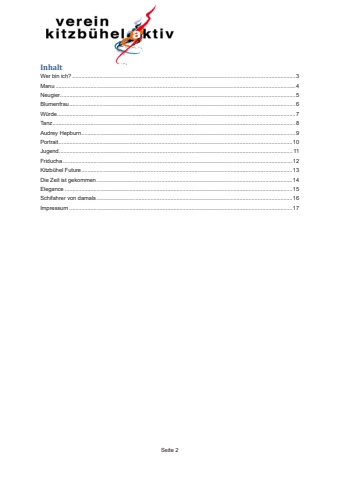 Seite 2Inhalt Wer bin ich? .................................................................................................................................................... 3Manu ............................................................................................................................................................... 4Neugier ............................................................................................................................................................ 5Blumenfrau ...................................................................................................................................................... 6W%u00fcrde .............................................................................................................................................................. 7Tanz ................................................................................................................................................................. 8Audrey Hepburn .............................................................................................................................................. 9Portrait ........................................................................................................................................................... 10Jugend........................................................................................................................................................... 11Friducha ........................................................................................................................................................ 12Kitzb%u00fchel Future ............................................................................................................................................ 13Die Zeit ist gekommen .................................................................................................................................. 14Elegance ....................................................................................................................................................... 15Schifahrer von damals .................................................................................................................................. 16Impressum .................................................................................................................................................... 17