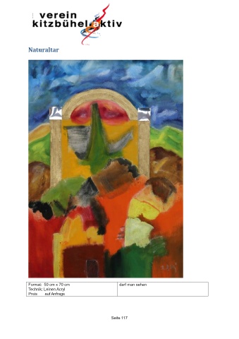 Naturaltar Format: 50 cm x 70 cm darf man sehen Technik: Leinen Acryl Preis auf Anfrage Seite 117