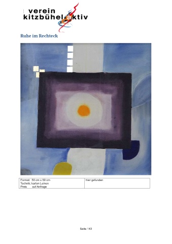 Ruhe im Rechteck Format: 50 cm x 50 cm hier gefunden Technik: karton Leinen Preis auf Anfrage Seite 143