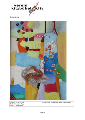 Goldstein Format: 50 cm x 7ocm soll nicht der Mittelpunk fü einen Mensch sein Technik: Leinen - Acryl Preis: auf Anfrage Seite 46