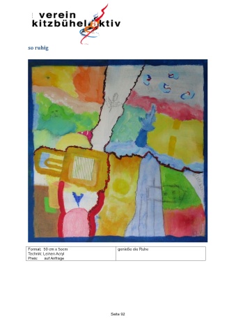 so ruhig Format: 50 cm x 5ocm genieße die Ruhe Technik: Leinen Acryl Preis: auf Anfrage Seite 92