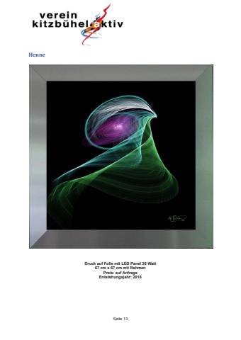 Seite 13 Henne Druck auf Folie mit LED Panel 36 Watt 67 cm x 67 cm mit Rahmen Preis: auf Anfrage Entstehungsjahr: 2018