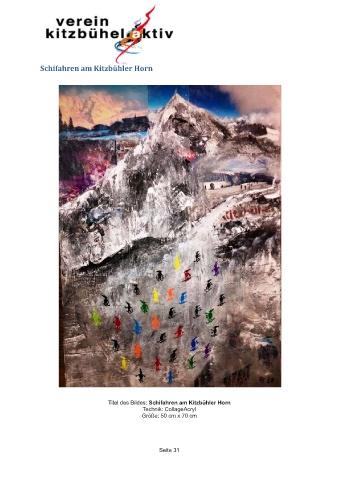 Schifahren am Kitzbühler Horn Titel des Bildes: Schifahren am Kitzbühler Horn Technik: CollageAcryl Größe: 50 cm x 70 cm Seite 31